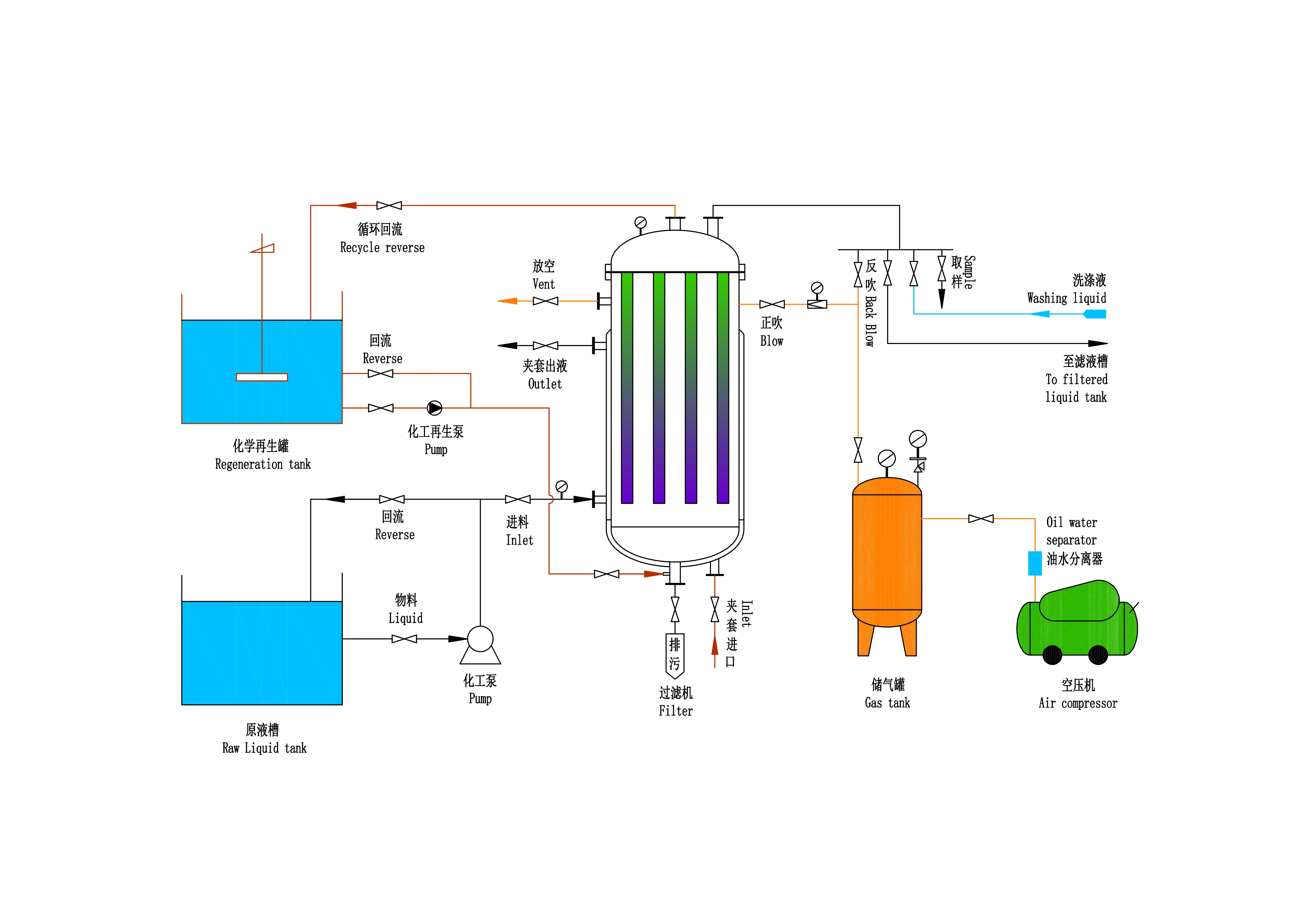 Fully automatic and systematic design; the system can achievemicron-level filtration, automatic discharge, automatic regeneration, andautomatic interlocking of liquid level, temperature, flow rate, and pump;