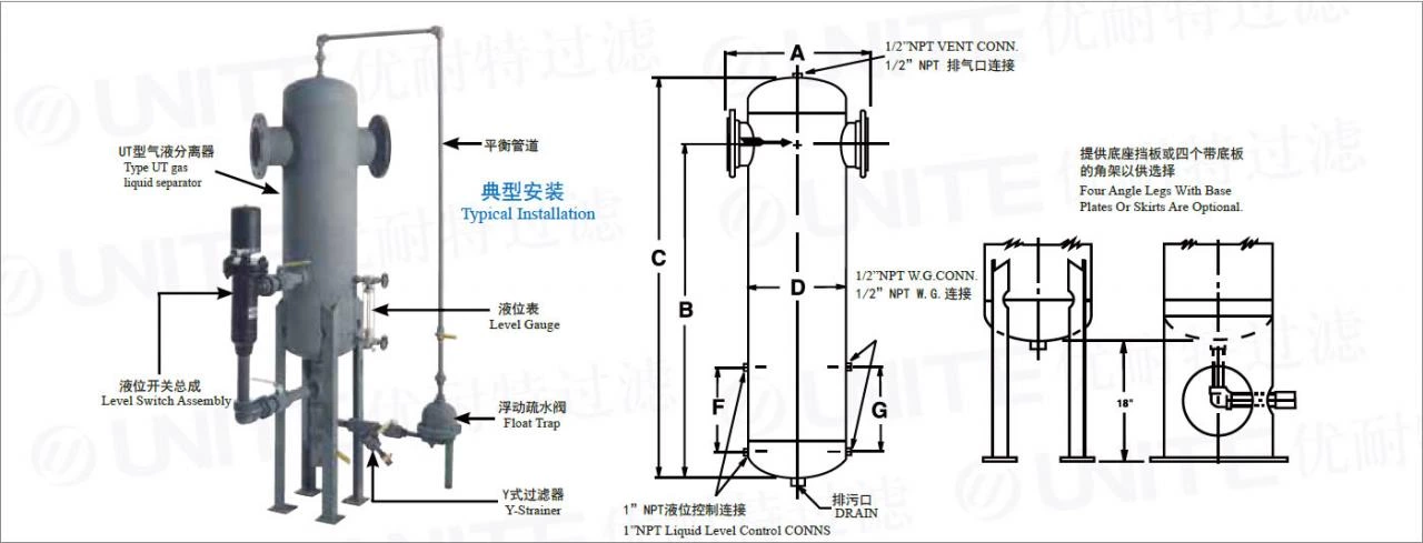 The Unitech TS type gas/liquid separator automatically removes 99% ofliquid and solid impurities larger than 10 microns in air, gas, and steamprocessing applications. This separator has no moving parts internally,therefore requiring no maintenance.